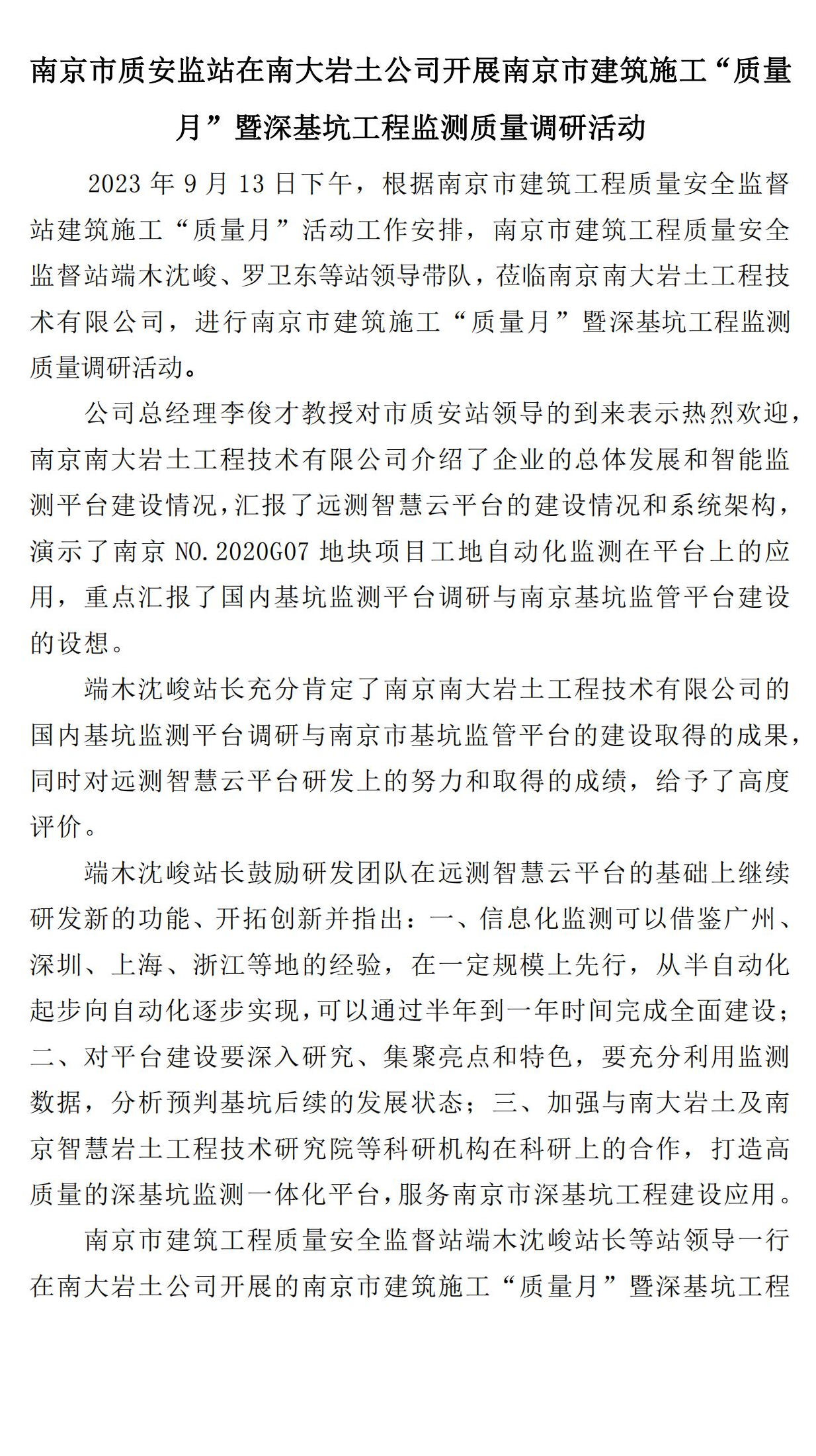 南京市建筑施工“質(zhì)量月”暨深基坑工程監(jiān)測(cè)質(zhì)量調(diào)研活動(dòng)